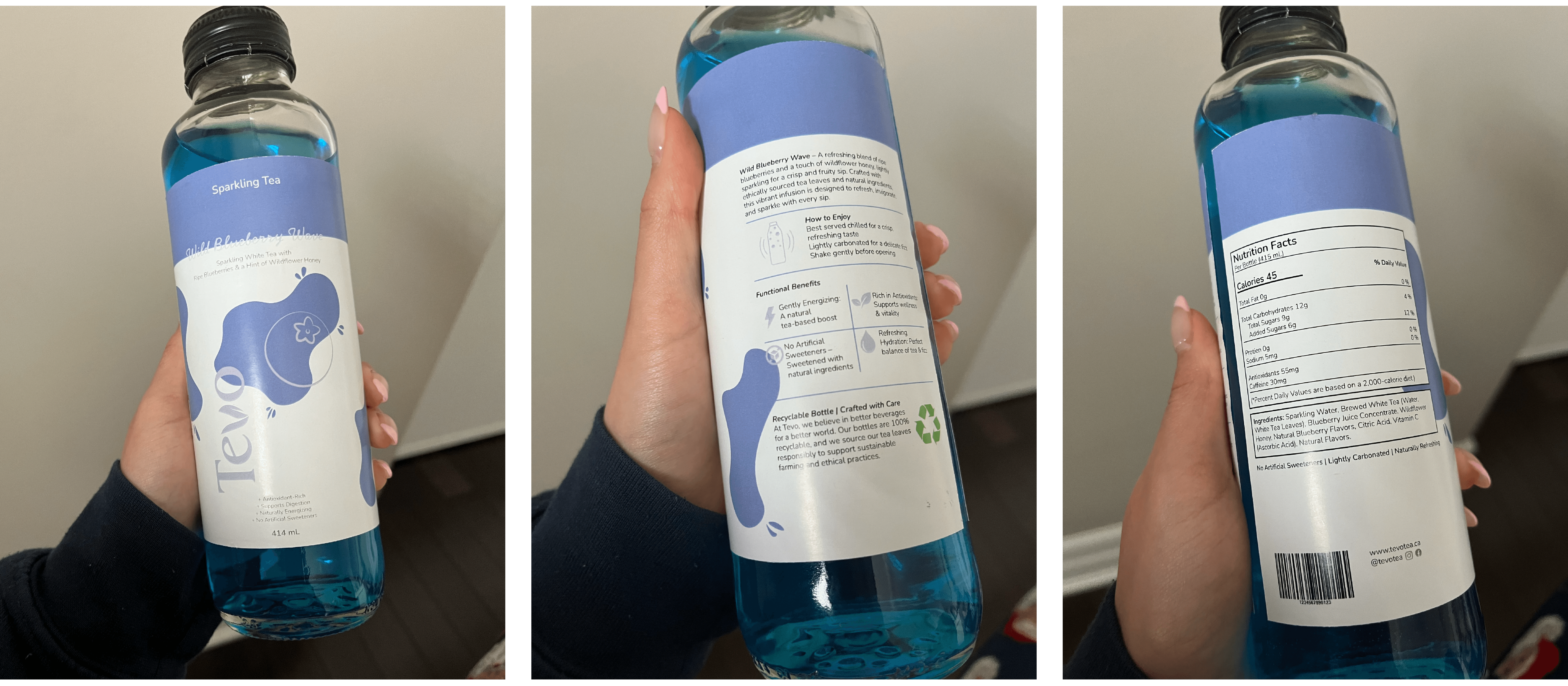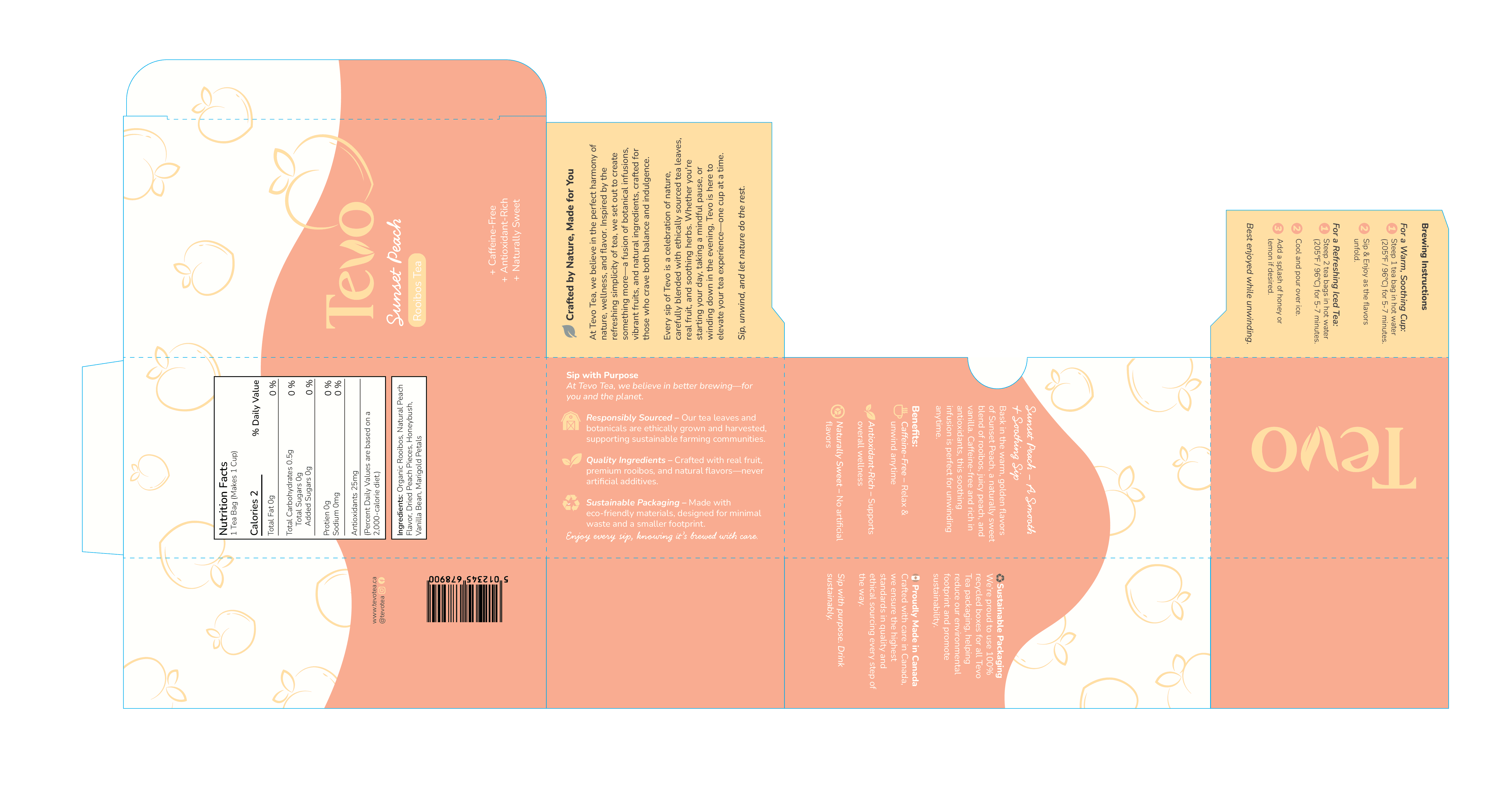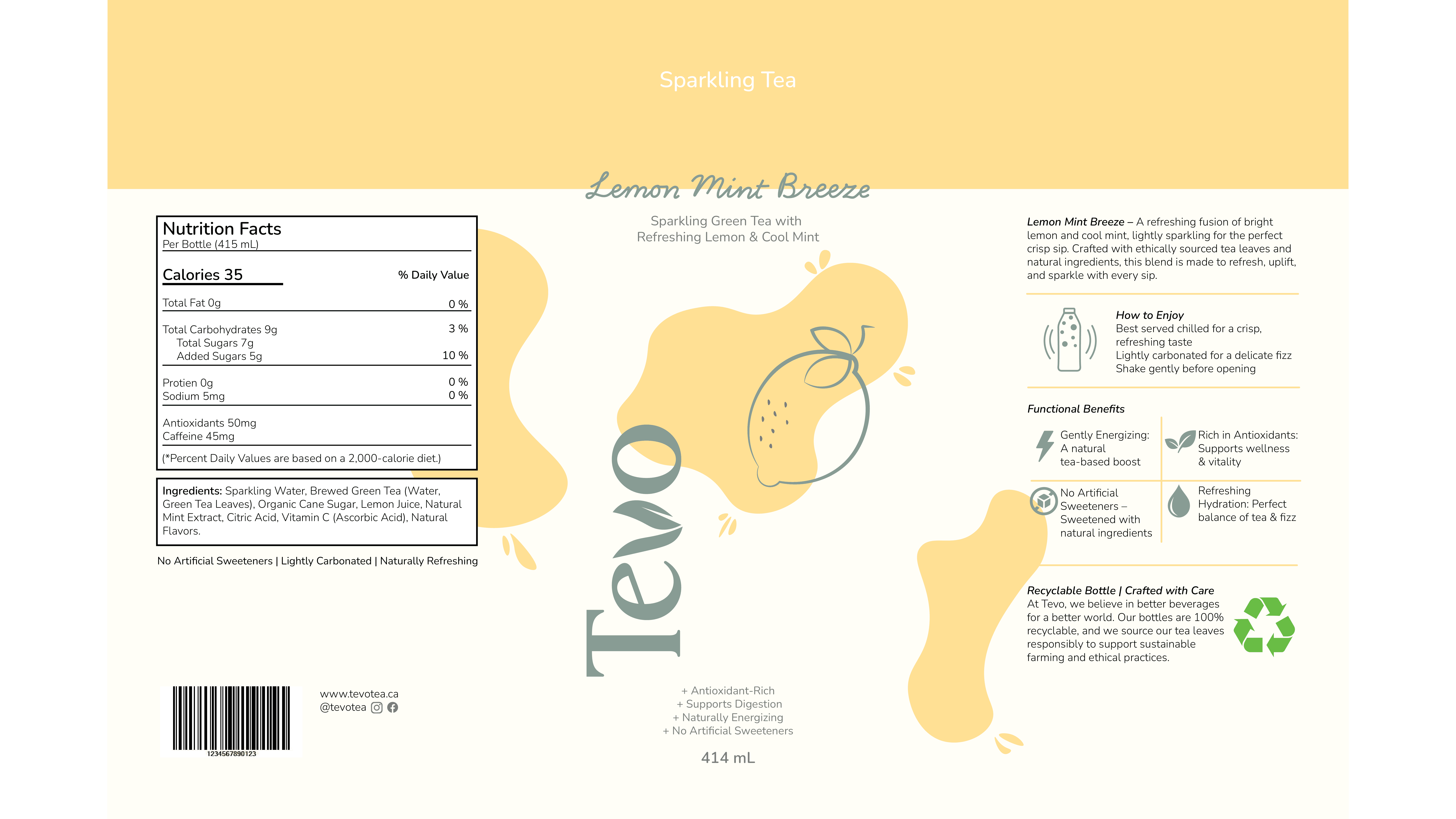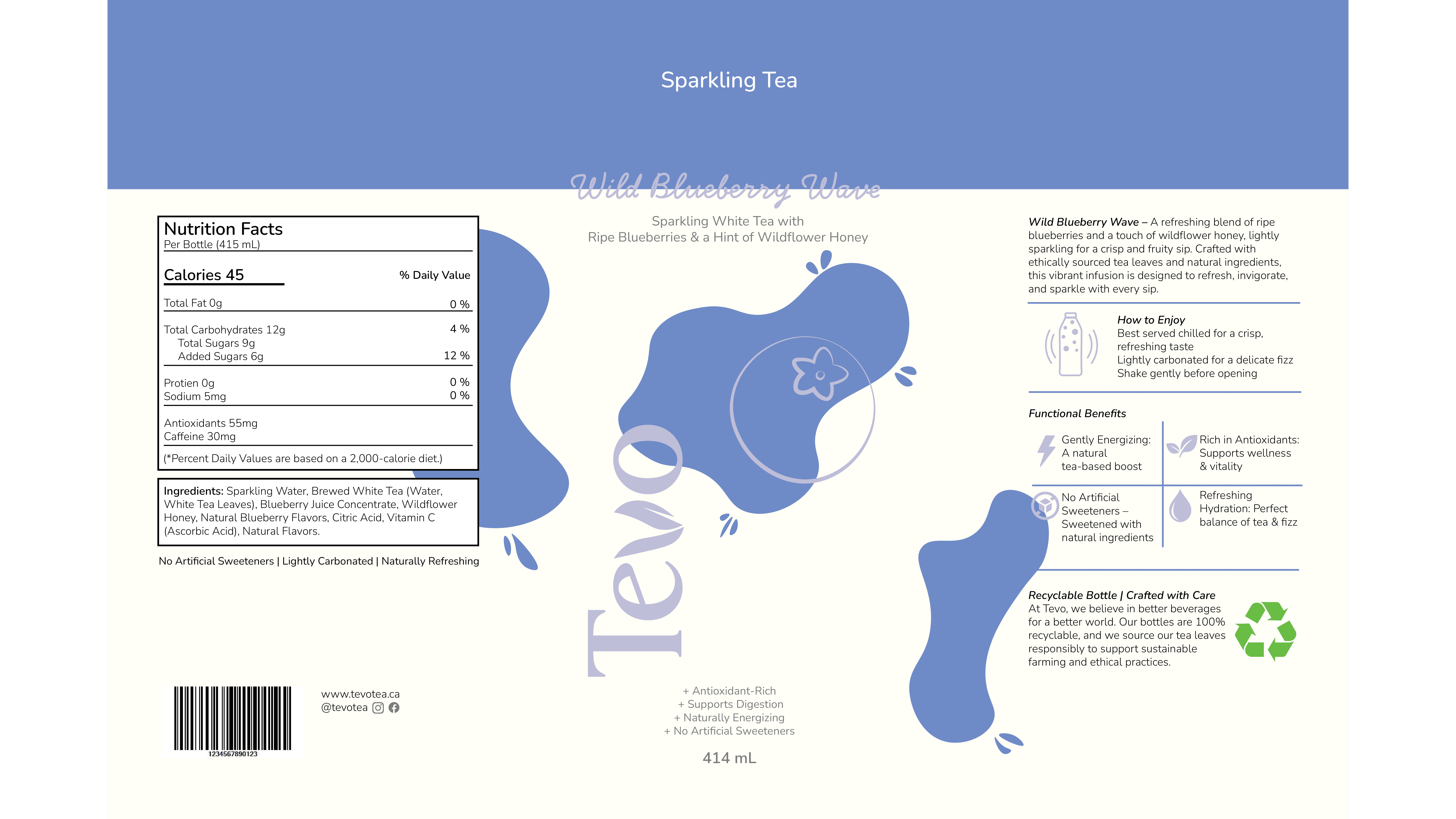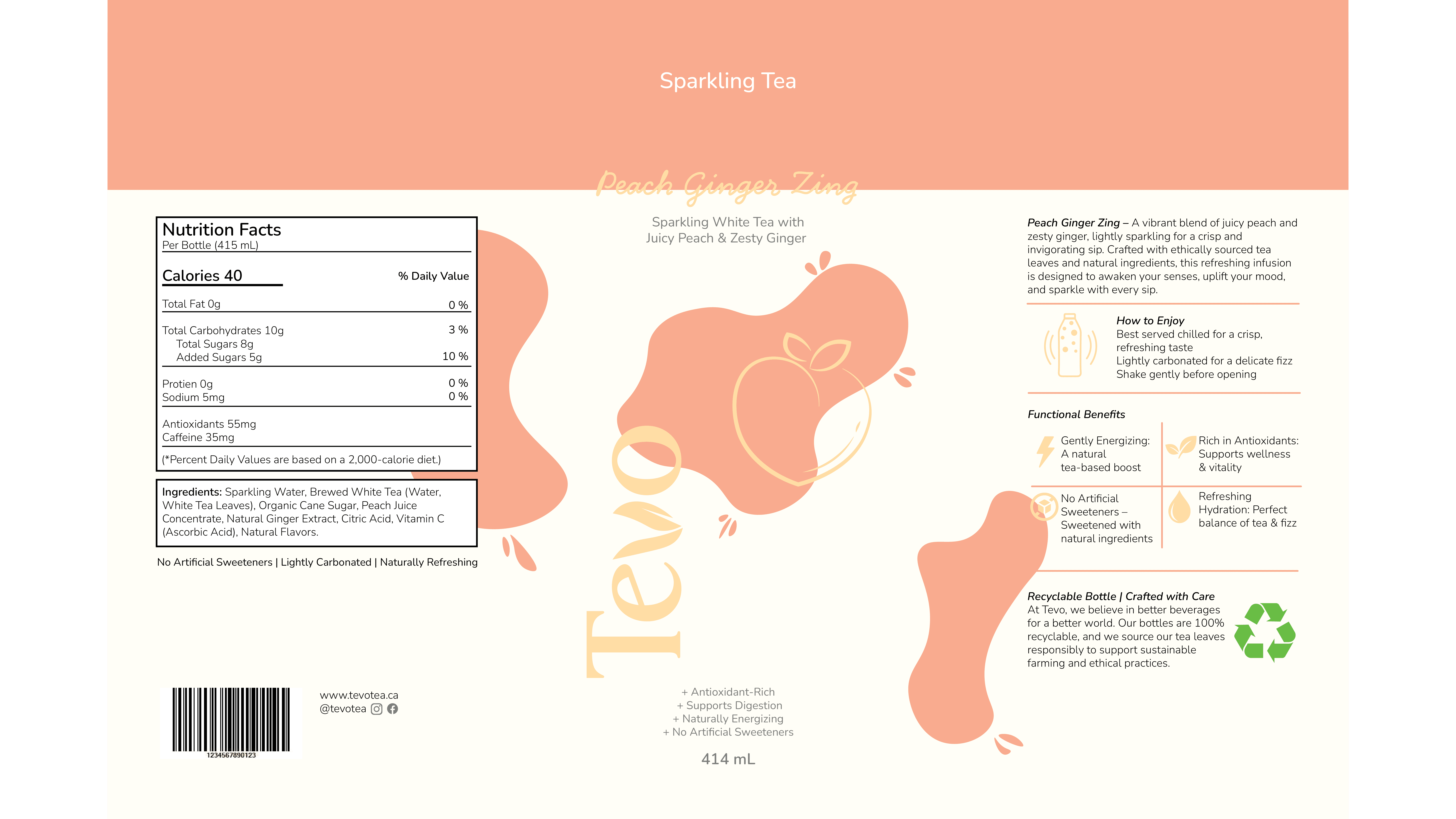 Tevo is a premium sparkling tea brand that was created as a refreshing, health-conscious substitute for sugary sodas. The brand creates a product that achieves a balance between enjoyment and health by combining real fruit flavors, botanical infusions, and light carbonation. In order to create a unified, scalable system suitable for retail settings, this project explores brand strategy, visual identity, and packaging design across various formats.
